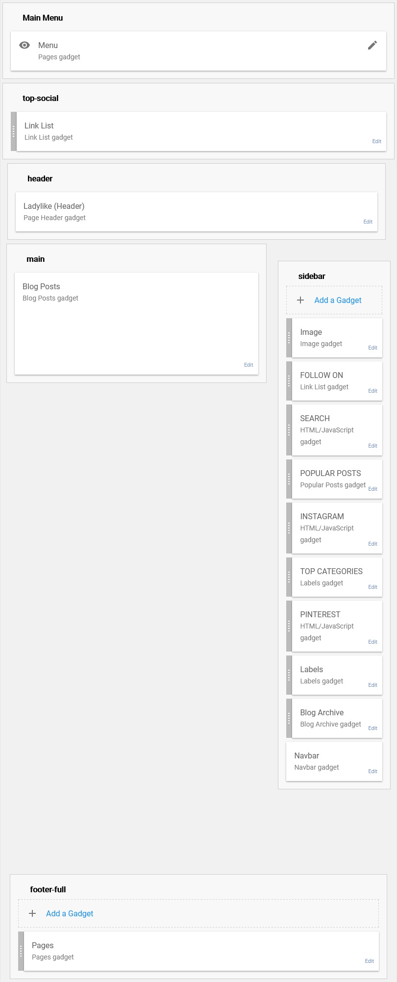 Go to “Layout” and find the “INSTAGRAM” gadget in the “Sidebar” section. Click on “Edit”.